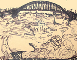 1992Tekening in marker (tweezijdige doordruktechniek met alcohol) van de Waal en Waalbrug bij Nijmegen.